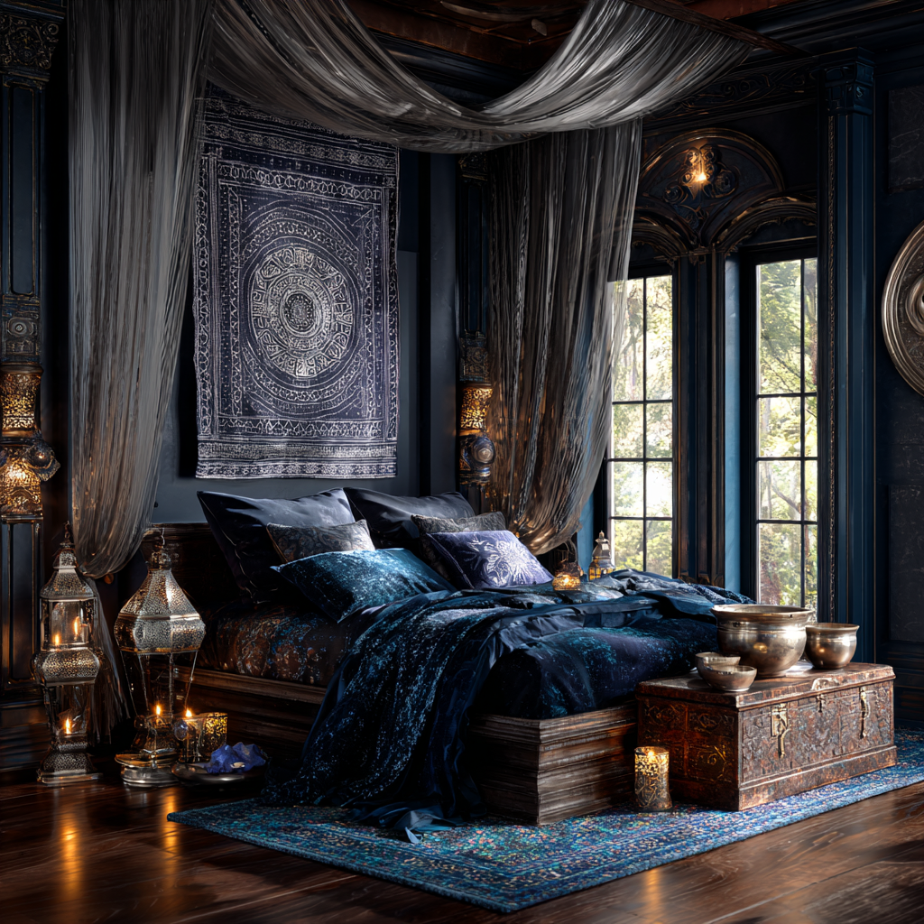 Together, these elements form a bedroom environment that feels protective, elegant, and energetically grounded.