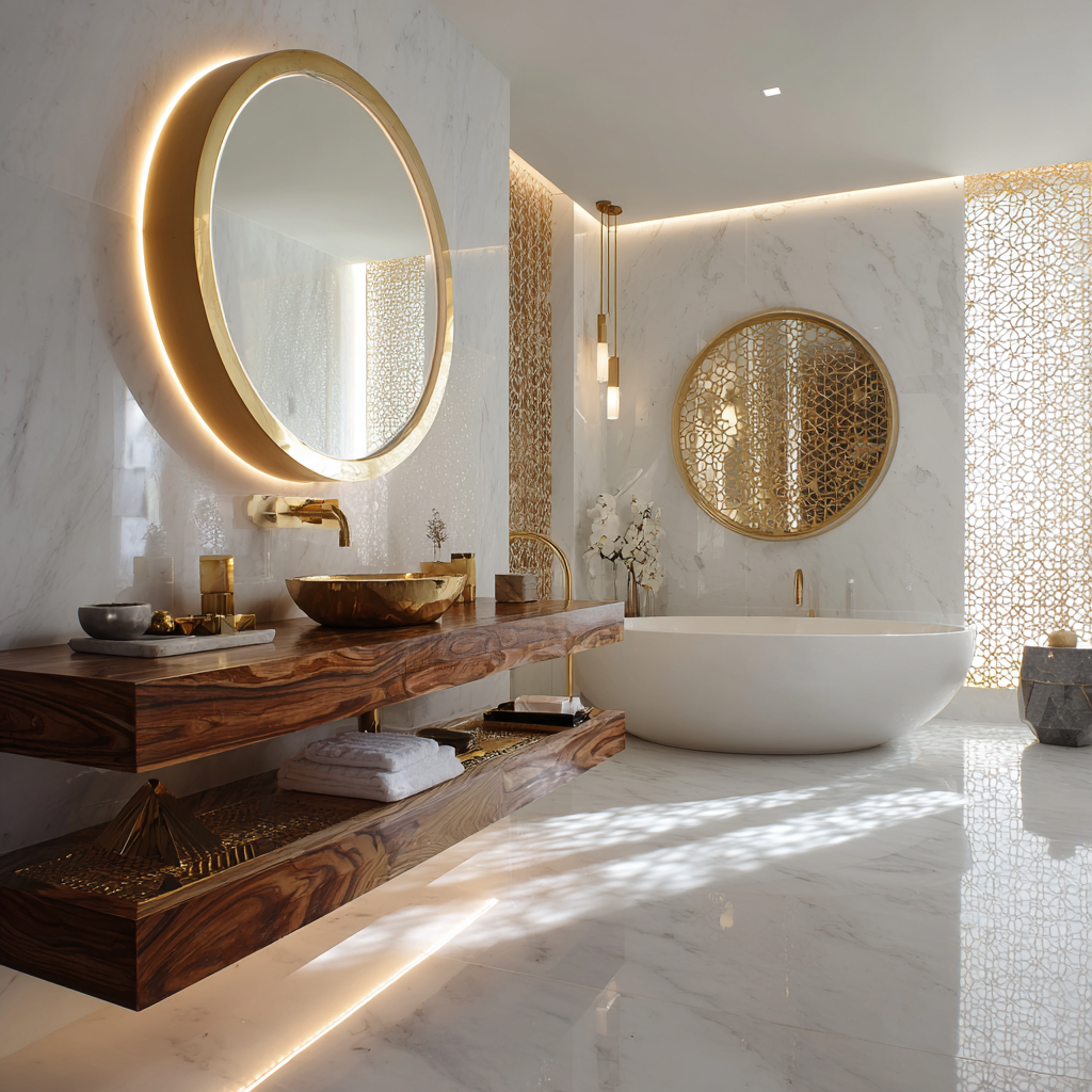 The revival element comes through curved shapes, sculptural bathtubs, and bold yet elegant lighting fixtures reminiscent of luxury interiors from the 1970s. Round mirrors, soft arches, and circular motifs subtly reinforce the idea of wholeness and unity.