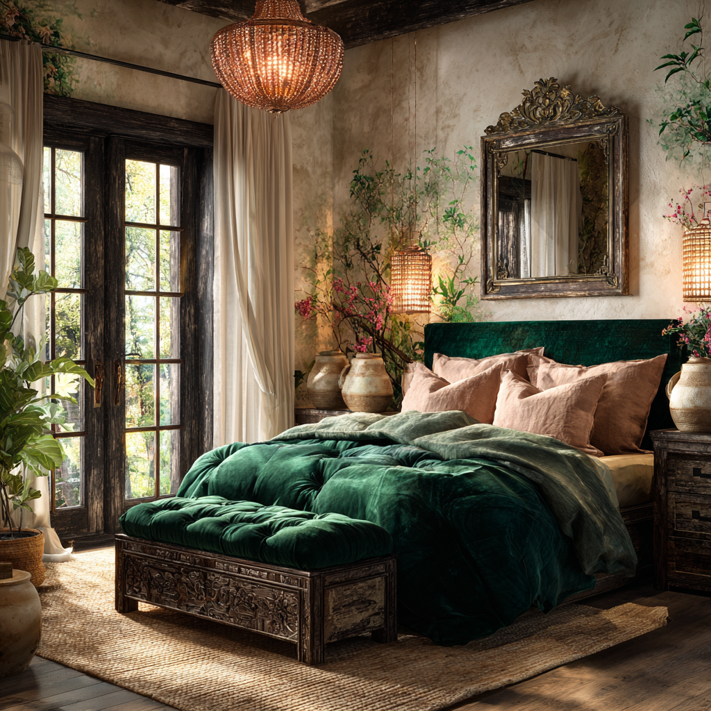 Emerald sofas or accent chairs with rose-gold lighting or hardware create emotional warmth without chaos.