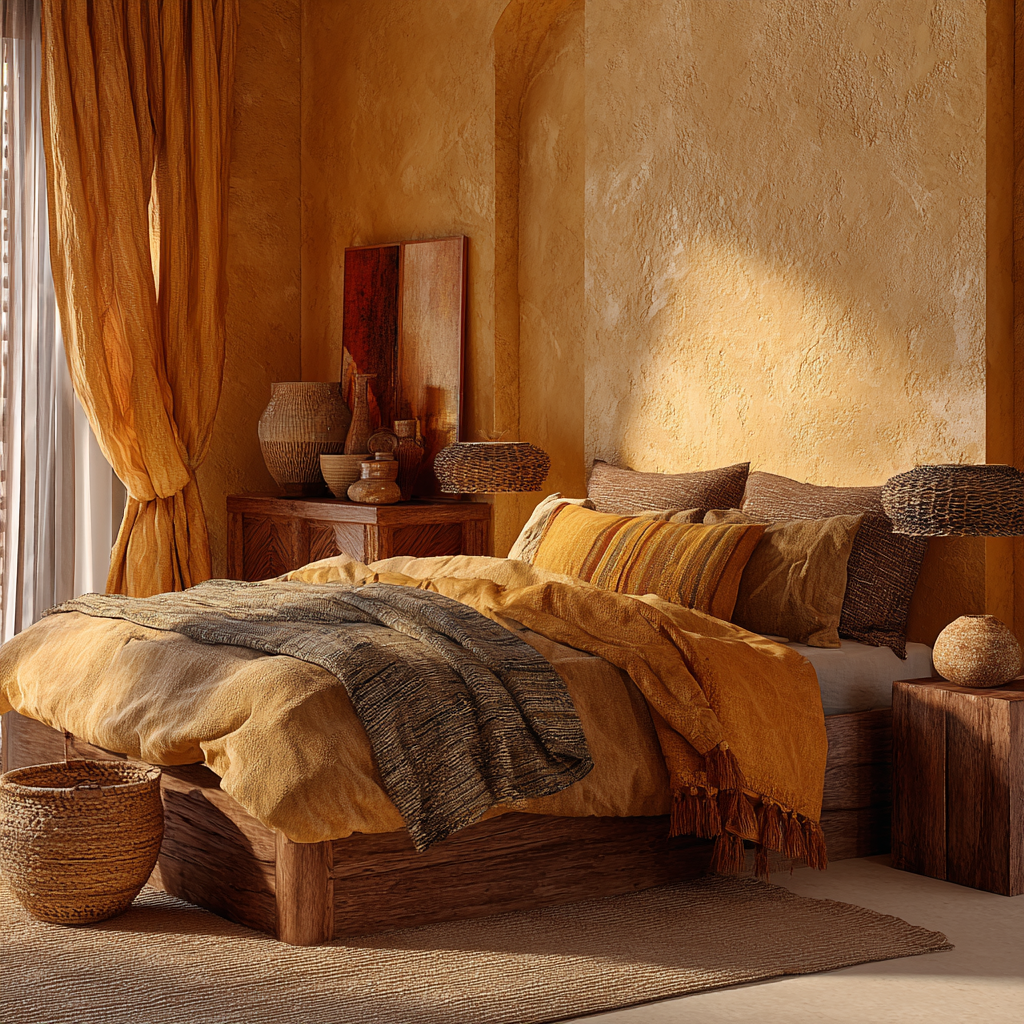 The African Rustic design style beautifully expresses the grounding energy needed for Solar Plexus healing. This aesthetic blends earth materials, handcrafted textures, and warm solar colors, creating a space that feels both strong and nurturing.