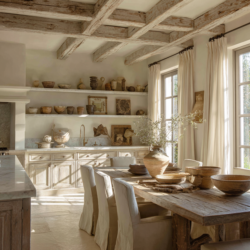 Unlike overly modern kitchens filled with sharp lines and technology, the African French Country approach emphasizes sacred simplicity. A rustic farmhouse table, handmade pottery, and fresh herbs in ceramic jars bring the space back to the rhythm of everyday life.